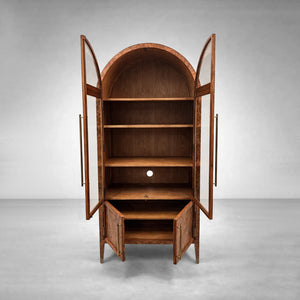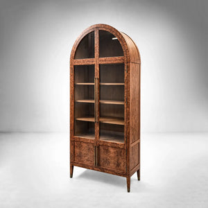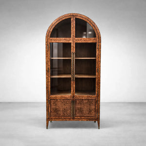 Elevate your space with the Hattie Burl Glass Cabinet, where organic curves meet the exquisite beauty of natural wood grain. Expertly crafted in Indonesia from solid oak and rare mappa burl wood veneer, each cabinet showcases unique swirling burl patterns—ensuring your piece is truly one-of-a-kind. The hand-applied finish enhances the wood's natural depth, while antiqued reeded hardware and exposed hinges add a touch of timeless elegance.